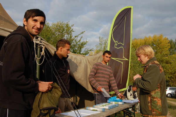 Několik dní pred odjezdem dolaďujem s Harym poslední detaily a kdo co vezme. Vše musí sedět. Ve stredu 5.10. odpoledne odjíždíme s naloženým autem směr Těšany. Cesta rychle uběhla, i rybník jsme našli poměrně rychle. Po privítání se známými jdeme s Harym na obhlídku revíru vytipovat si místa, která bychom chtěli vylosovat. Víme, že je hodně vázek v mělčích částech rybníka a má prijít ochlazení, tak bychom chtěli jako většina týmů místa spíše u hráze, nebo ve stredu rybníka. Večer se nese v poklidném duchu. Popíjíme pivečko, jíme maso a klábosíme s kamarády. Ráno vstáváme odpočatí a jde se losovat. Losovat jdu já a jsem porádně nervózní. Jdu na radu a losuji lovné místo s číslem 9. Z místa máme zprvu smíšené pocity. Všichni mají vylosováno a rozjíždíme se na lovná místa. Naše místo se nachází na mírné špici na rozhraní hloubky a mělčiny, kde by snad nemuselo být tolik vázek. Uvidíme, co nám ukáže echolot. Vybalujeme věci, stavíme tábor, chystáme krmení,všechno boilie krom Homéra zaléváme Akáčkem dané príchutě, nafukujem člun atd. V 11hod vyjíždíme na vodu a zjišťujeme, že se zde zas tolik vázek opravdu nenachází, na dně je černé páchnoucí bahno od tlejících rostlin, občas nějaký keríček nebo trs trávy. Tyčovku dáváme do hloubky 5m asi 80m od brehu a krmíme pred ní 25kg partiklu a 1,5kg boilie a pelet. Poté si čístíme vodu u brehu od větví, aby nám do nich ryby nezajížděli. Vše máme nachystané a čekáme až uderí 13.hod a my mohli nahodit. Ve 13hod letí do vody po celém rybníku desítky montáží všeho druhu. Jako nástrahu jsme na začátek zkusili Snipera obaleného v těstě stejné príchutě, F1 v esenci s plovkou, samotnou plovku obalenou v těstě Sniper a peletu. První záběr prichází poměrně rychle po nahození (po 20ti minutách) na můj levý prut. Záběr byl opatrný, ale podle tahu ryby jsem věděl, že bude hned na začátek bodovaný kapr. Lysec 4,3kg s mírou pres 60cm je dobrý začátek. Myslel jsem si, že jsem ulovil prvního kapra závodů, ale u hráze měli bodovanou rybu hned po 5minutách. Potom se odpoledne ryby docela zklidnili a nic moc se neděje. Další dvě bodované ryby a nějaké prcky zdoláváme až na večer a ujímáme se prozatím vedení. V noci prichází silný vítr a déšť. Ryby však nespolupracují a my nemáme v noci ani záběr. Až k ránu se mi ozývá pravý prut a je na něm kaprík okolo 40cm. Beru do ruky prut s raketkou a jdeme krmit. Hary do ní láduje velké pelety, boilie a repku s konopím. Po rybníce se občas chytne nějaký kaprík, ale není to žádný zázrak. V noci nejvíce nachytal tým na krajním místě 20 naproti nám, asi na nejmělčí části, kde je sice hodně vázek, ale ryby zde mají klid. U hráze se taky něco chytlo a my se pohybujem někde okolo 5.místa. Během dopoledne nám prichází série záběrů od kapríku velikosti max. 35cm. Počasí se začíná pomalu měnit a ochlazuje se. Odpoledne to vypadá, podle mraků, zase na pěkný déšť. Kapríkům akvarijní velikosti nedělá stále problém atakovat naše nástrahy ve vodě. 20mm kulička obalená těstem pro ně není prekážkou. Vytahujeme taky pár kaprů mezi 45 a 54cm, které se smutným výrazem, že nemněli o něco víc hned vracíme do svého domova. Vítr fouká na naší stranu , což je sice dobre, ale lépe na tom budou určitě týmy na mělčině. Taky že jo.Týmy 12 i 11 nás prechytávají. I na místech 18 a 19, která jsou taky velice slibná místa, mají pár bodovaných ryb. Snažíme se vymyslet jak dostat bodovaného kapra do podběráku. Vítr zesiluje a vytrvale prší. Naše lovné místo se mění v bahenní lázně, kde každý rychlý pohyb si člověk musí promyslet, aby neskončil na zemi v bahně. Presně to se mi také stalo. Padl jsem do bahna a hned nato jsem sklouzl nohama ještě do vody. No paráda J. Pri krmení se mi také povedlo urvat naši jedinou raketku, ale naštěstí se zachytla sousedícímu týmu o vlasce a tak nám ji vytáhli. Je tu večer a my znovu dokrmujem, protože lovné místo je určitě vyzobané od té drobotiny, které jsme vytáhli poměrně dost. Hary zkouší i na krmelec u brehu. Darí se mu sice vytáhnout dva kapry pres 50cm, ale na úkor asi 30ti malinkých kapríků. Bodovaná ryba stále nikde. Máme porád zatím jen tri. Týmy na mělčinách se rozchytávají a my potrebujeme udělat nějaké body jinak to nedoženeme. Je tu večer, krmíme hodně Sniperem, F1, které jsou pěkně naložené v Ak a několik hrstí Homéra a pelet. Máme snad všechno červené od Snipera (ruce,oblečení,pruty, i navijáky). Pod háček dáváme 20mm koule obalené těstem a namočené v Ak. Na můj levý prut, na kterém jsem mněl těsto Homér najednou prichází záběr a je to bodovaný lysec. Paráda! Okolo 23hod. prichází další a do půl hodinky mám dalšího bodovaného. To se nám to pěkně rozjíždí. Hary prestal chytat na krmelec, protože záběry chodí z dálky od tyčovky. Čas letí a bodovaní kapri na našem kontě rychle pribývají. Sousedící tým na místě 10 také chytá, ikdyž né tolik, ale hecuje nás to nepolevovat a snažit se vymáčknout z téhle noci maximum. Chvilkama ani nevíme, kde nám hlava stojí a jeden prut strídá druhý. Mě to nejvíc šlape na těsto Homér a Harymu na Snipera. Nejlepší série je asi mezi 2. a 3.hodinou, kdy jsme udělali zhruba deset bodovaným kaprů. Za celou dobu nemáme všechny čtyri pruty ve vodě. Když to není zrovna bodovaná ryba tak je to prcek nebo i karásek se občas splete. Okolo 6. ráno máme asi 20 bod. ryb, ale naše série nekončí. Po každé hodině kobrujeme několik hrstí boilie. Od rozhodčích se dozvídáme, že chytáme nejvíc my a tým na místě 20. Do osmé hodiny zdoláváme dalších pět kaprů