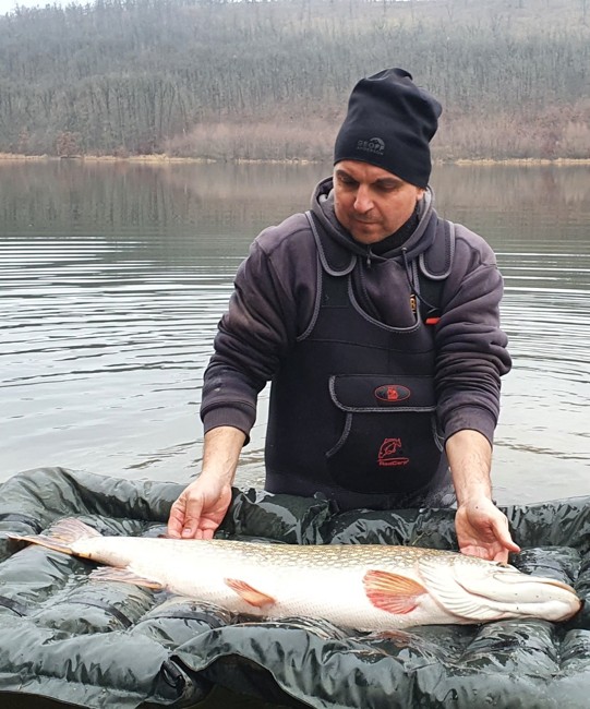 Dnes moje nej-nej štika co jsem kdy chytl. 97cm na svazovce a super souboj přes 40 minut! Plave dál a děkuji za gumu co super pracuje ve studené vodě a pro mě vyrobil Slovenský kamarád- Viliam Bellay a Andrea Bellayová -Čillíková.
