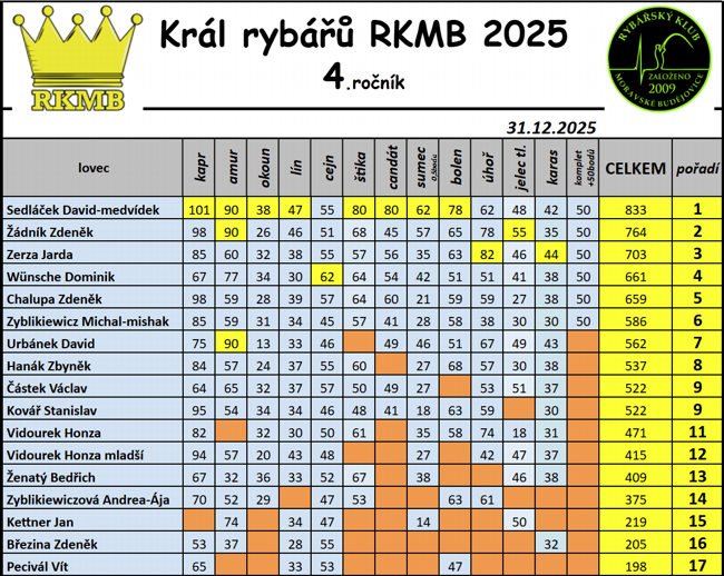 Po zaplacení startovného obdrží každý závodník měřící podložku (či značku na měrku, daného roku), na který přiloží ulovenou rybu a udělá pár zřetelných fotografií. Lovec fotografii zašle co nejdříve pořadateli závodu do skupiny messenger -král rybářů RKMB . Uznané jsou pouze úlovky odfocené na oficiální podložce(malé i velké)! Fotografie úlovku bez oficialní podložky, se známkou aktuálního ročníku, nebudou uznány. Bodované ryby jsou: kapr obecný, amur bílý, okoun říční, lín obecný, cejn velký, štika obecná, candát obecný, sumec velký, bolen dravý, jelec tloušť, úhoř říční, karas(obecný, stříbřitý).